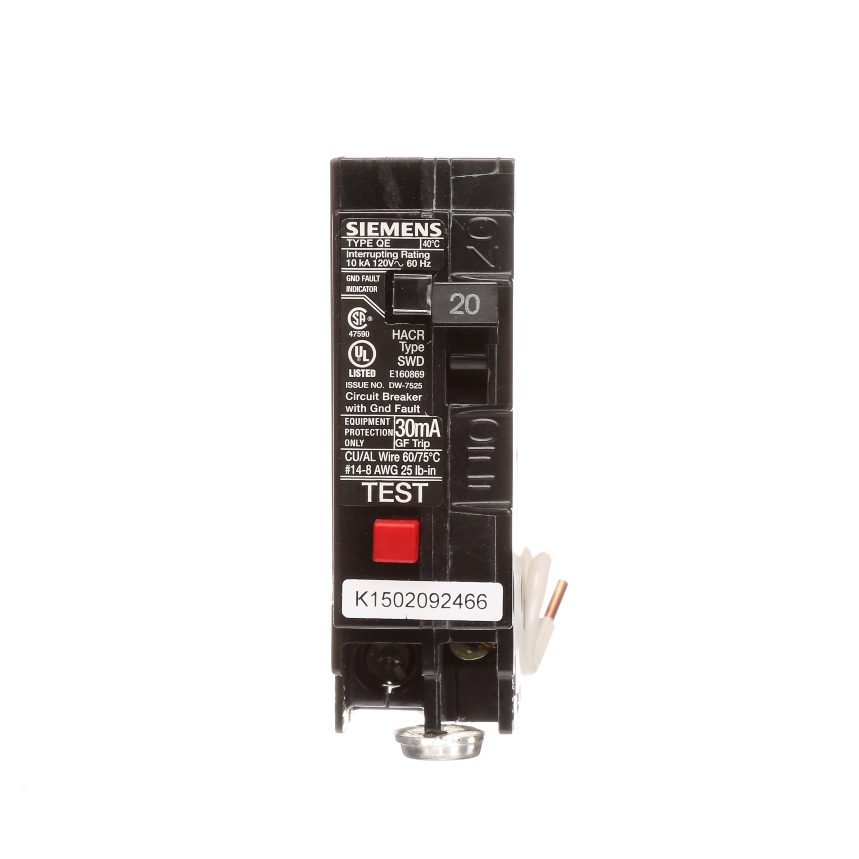 Siemens Low Voltage Residential Circuit Breakers Miniature Circuit Breakers GFCI - Equipment Protect 1-pole plug-on 10k are Circuit Protection Load Center Mains, Feeders, and Miniature Circuit Breakers. Sub Brand N/A Type QE Special Features N/A Application Electrical Distribution Standard UL 489 Voltage Rating 120V Amperage Rating 20A Load Rating N/A Frequency Rating N/A Phase N/A Frame N/A TripType N/A Trip Range Thermal Magnetic Interrupt Rating 10 AIC Number Of Poles 1P